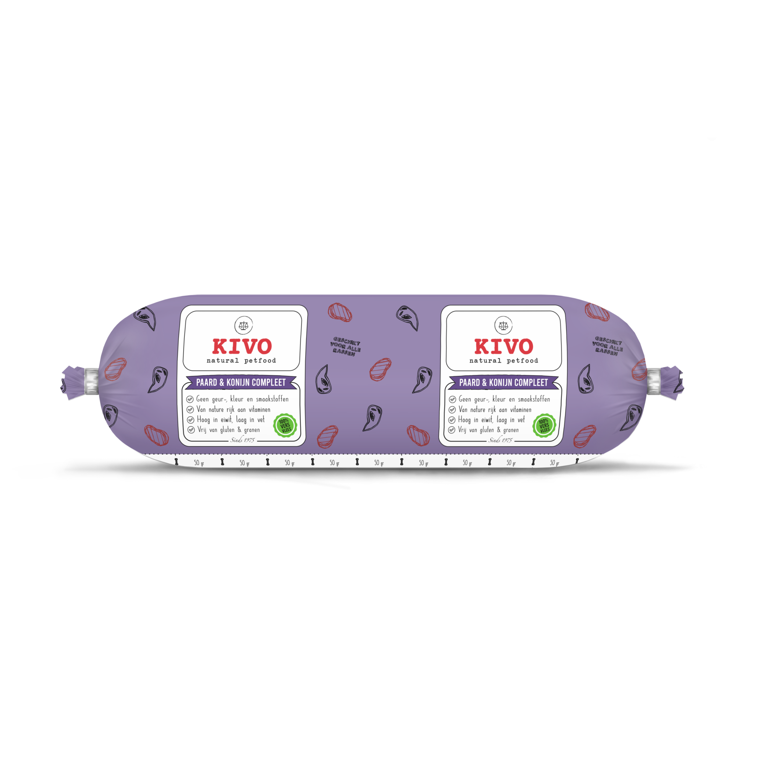 Deze complete maaltijd bevat alle essentiële voedingsstoffen, bouwstoffen, vitaminen en mineralen die uw hond nodig heeft en is geschikt om dagelijks aan uw hond te geven. De vitaminen en mineralen die in onze maaltijden zitten worden gewonnen uit natuurlijke bronnen. De natuurlijke bronnen in deze maaltijd zijn van een hoefdier, namelijk het paard en van een haasachtige, namelijk het konijn. Deze bevatten hoogwaardige ingrediënten zoals organen als hart, nier, lever, long, ook bevat het spiervlees en karkas. Wij gebruiken geen kunstmatige stoffen of chemische vitaminen. Wel is het verstandig om meerdere diersoorten per week te voeren omdat je hond zo aan een groter scala van verschillende bouwstoffen en aminozuren komt.