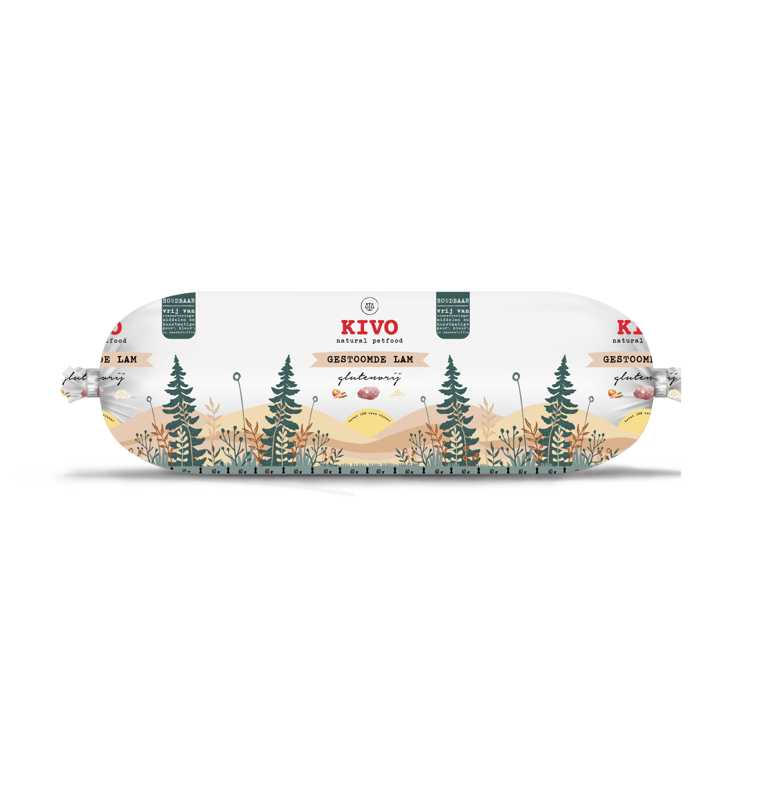 78% lamsvlees, 15% zilvervliesrijst, 3% groenten, 2% fruit.